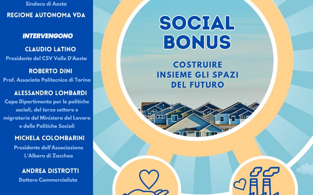 Per illustrare i dettagli del social bonus, i suoi vantaggi sociali ed economici, il CSV VDA ODV e il GAL Valle d’Aosta, con il patrocinio del Comune di Aosta e del CELVA, organizzano l’evento “Social bonus: costruire insieme gli spazi del futuro”, in programma sabato 21 dicembre alle 14.30 al Salone Ducale del Municipio di Aosta.