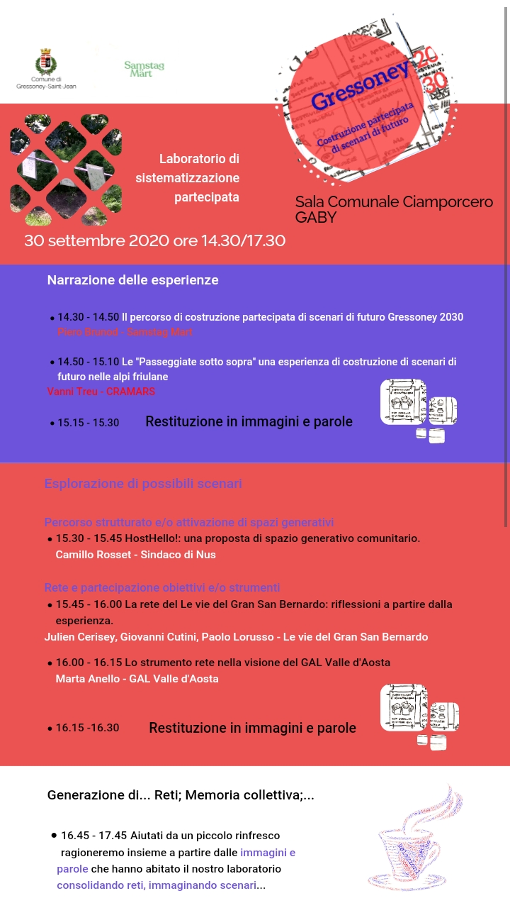 14.00 : 17.45 – Pomeriggio di studio e incontri con amministratori, rappresentanti delle associazioni, operatori locali presso la Sala Polivalente del Comune di Chamois (vedi programma allegato)