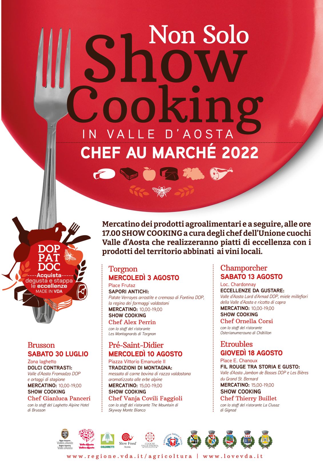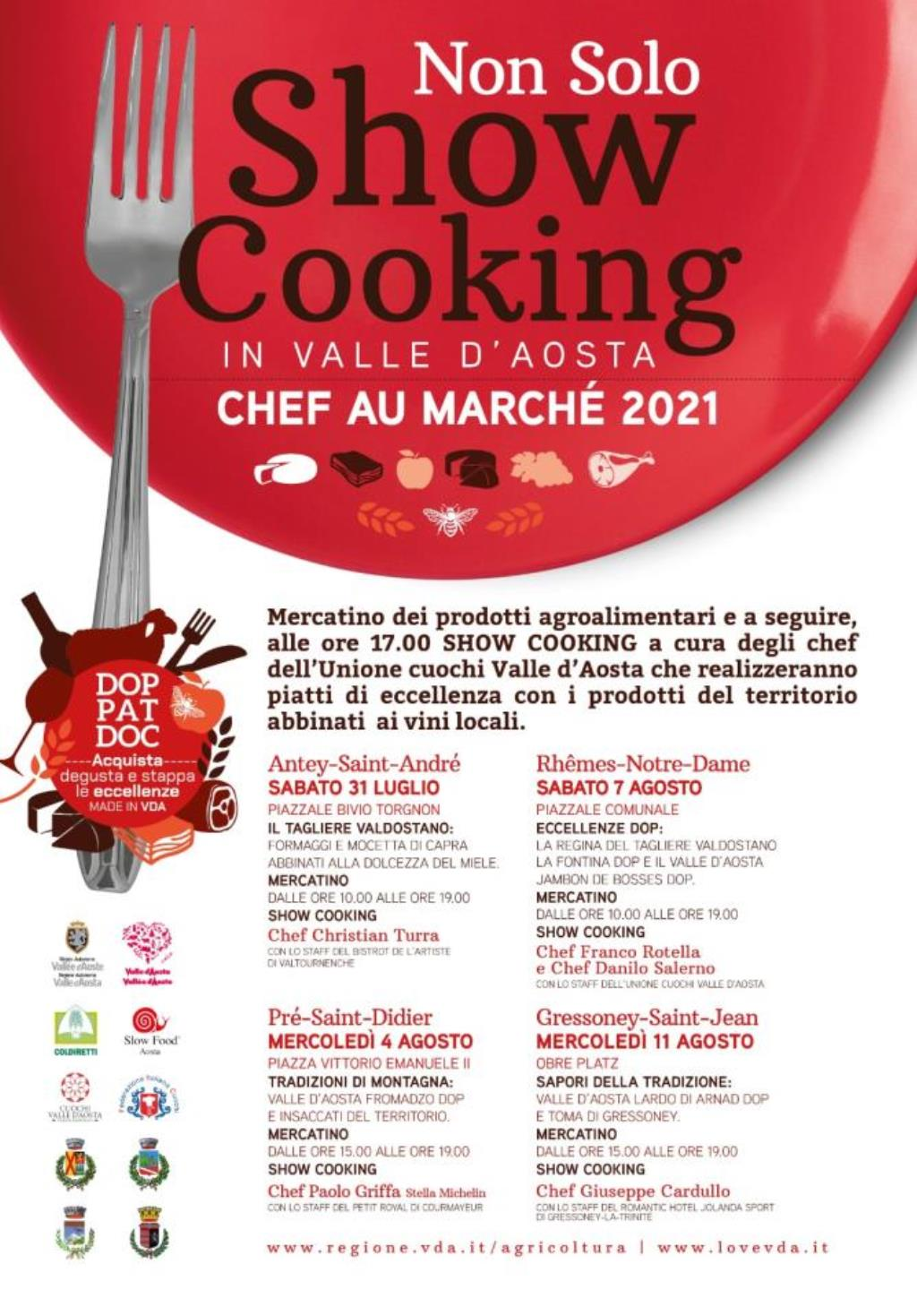 Anche per il 2019, l’Ufficio del Turismo di Aosta ripropone l’iniziativa Non solo show cooking, mercatini di prodotti agroalimentari della Valle d’Aosta, durante i quali Chef esperti realizzeranno finger food e piatti di eccellenza con prodotti del territorio. Ogni appuntamento prevede uno specifico focus tematico sulle diverse filiere con la presentazione e l’illustrazione dei prodotti DOP, DOC e PAT utilizzati.