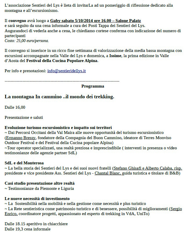 I programmi completi della manifestazione sono disponibili in allegato. Maggiori informazioni su modalità di partecipazione e prenotazione possono essere richieste inviando una mail a info@sentieridellys.it.