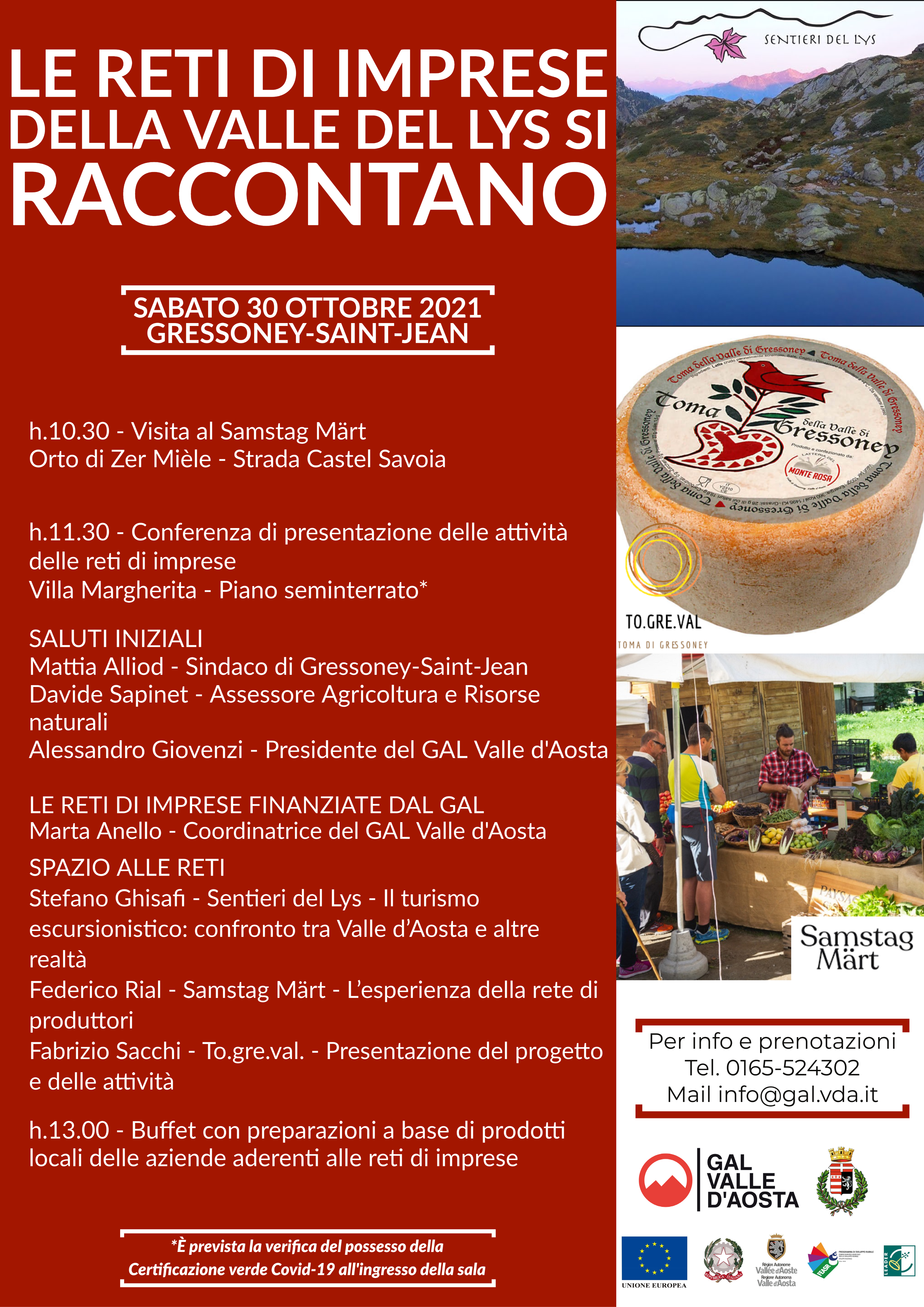 Si è tenuto venerdì 29 e sabato 30 ottobre 2021 l’evento “Le reti di imprese della Valle del Lys si raccontano”, organizzato dal GAL Valle d’Aosta al fine di valorizzare e promuovere i progetti finanziati nell’ambito delle sottomisure 16.3.1, 16.3.2 e 16.4.1 del PSR Valle d’Aosta 2014-2020 nella Valle di Gressoney.
